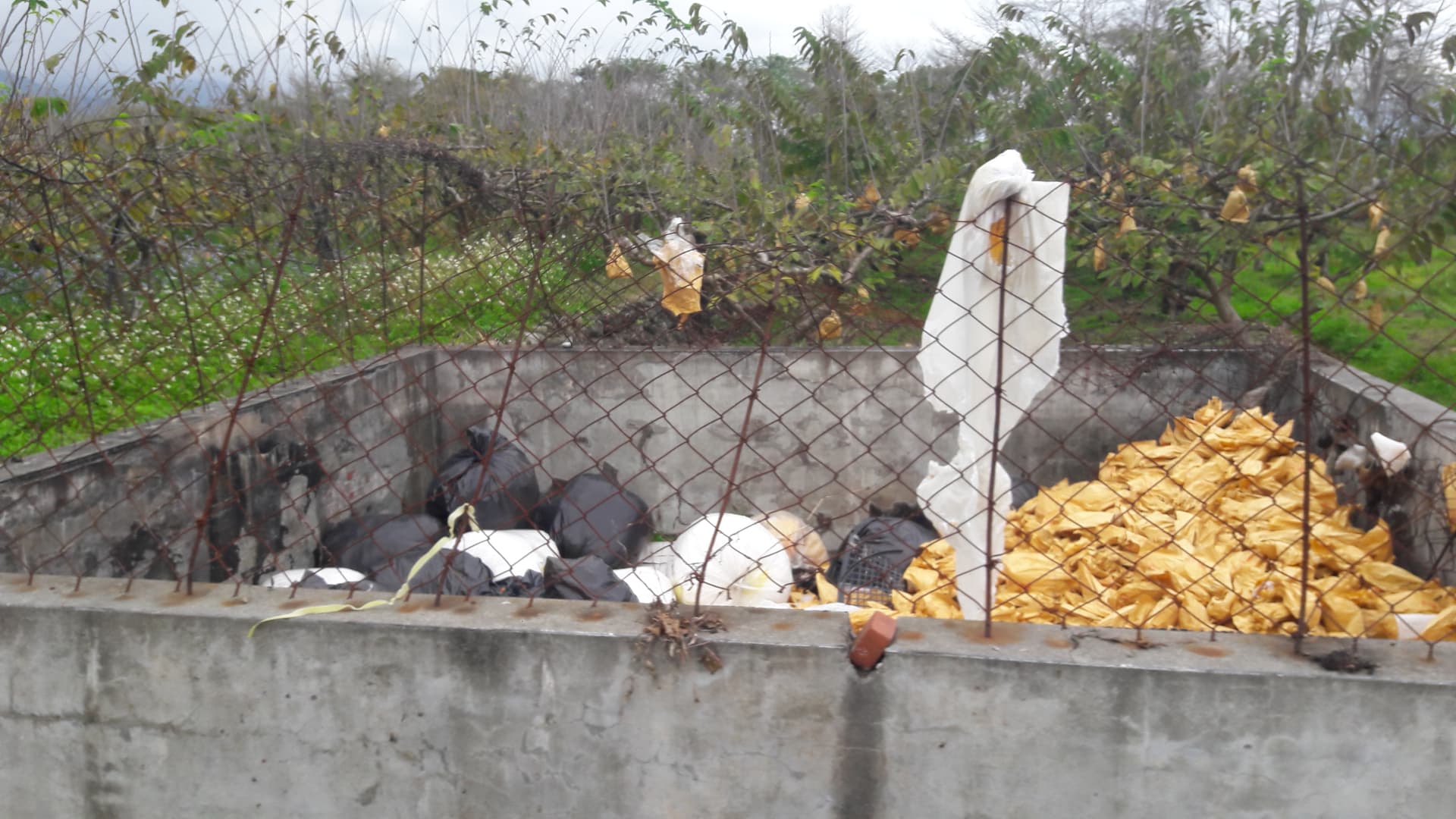 On the way there… Here is an intentionally made concrete basin for communal burning of garbage. And hooked right up to the ditch to enable convenient cleaning (aka our water raised food filters it) I dont think i need to coment how beyond friggen retarded this is. So here are pics of banana bags (plastic lined paper with pesticides and herbicides caked on), Annona fruit bags (plastic lined with even more pesticiedes caked on), and guava foam fruit casings (actual foam caked in pesticides and herbicides) the small stuff put into addional plastic bags, ya know…for good measure!