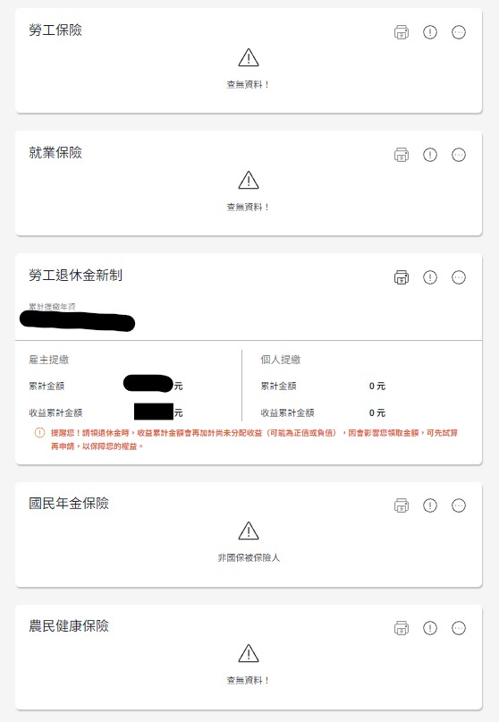 Just go to the nearest branch of the Labor Insurance Bureau and they will sort you out with complete printouts covering your entire history with labor insurance and the New Pension Scheme.