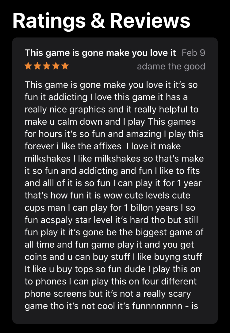 This game is gone make you love it it’s so fun it addicting I love this game it has a really nice graphics and it really helpful to make u calm down and I play This games for hours it’s so fun and amazing I play this forever i like the affixes I love it make milkshakes I like milkshakes so that’s make it so fun and addicting and fun I like to fits and alll of it is so fun I can play it for 1 year that’s how fun it is wow cute levels cute cups man I can play for 1 billon years I so fun acspaly star level it’s hard tho but still fun play it it’s gone be the biggest game of all time and fun game play it and you get coins and u can buy stuff I like buyng stuff It like u buy tops so fun dude I play this on to phones I can play this on four different phone screens but it’s not a really scary game tho it’s not cool it’s funnnnnnnn - is