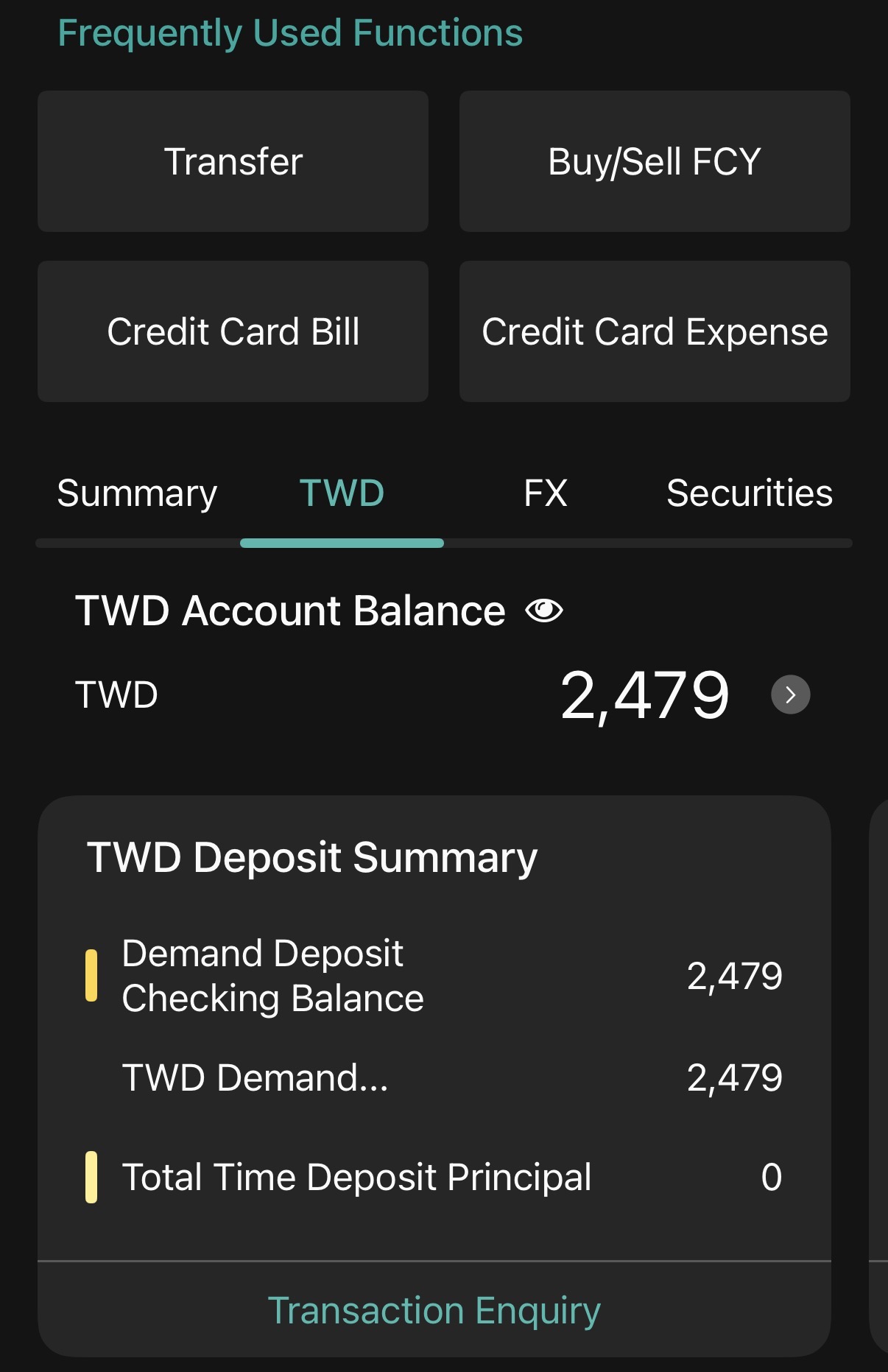 Here’s a screenshot from ESun’s iPhone app. TWD checking account, foreign currency checking account, securities balance and positions, etc