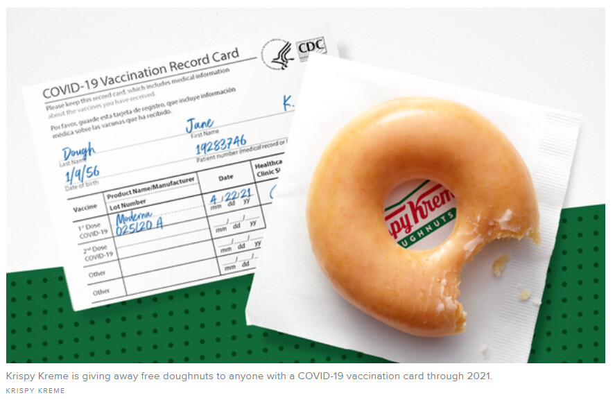 And it's not just a one-time offer â vaccinated individuals can go back every single day and continue getting free doughnuts through all of 2021.