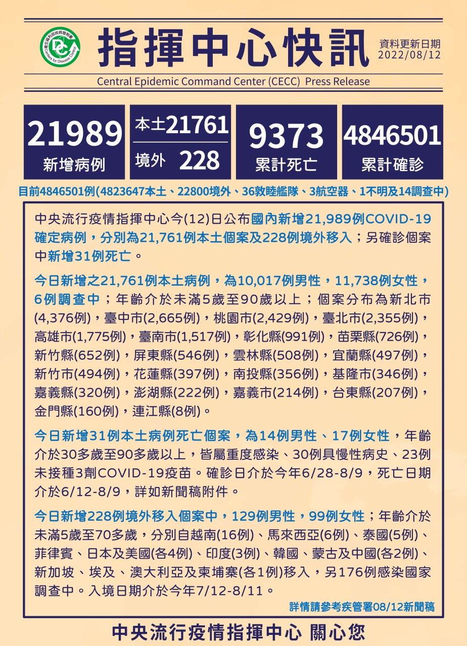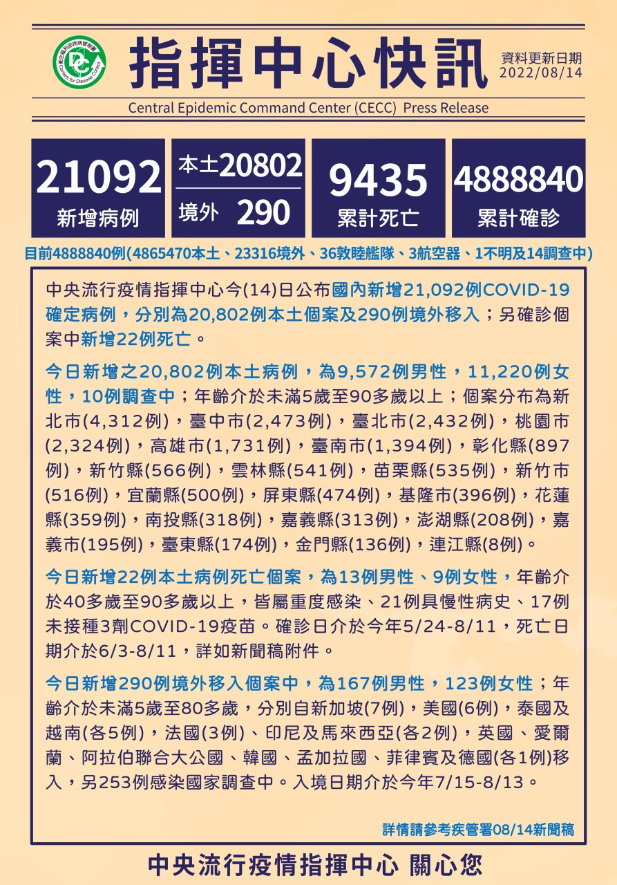 The command center said that there were 21,056 new local cases today, including 9,658 males, 11,388 females, and 10 under investigation; the age ranged from under 5 years old to over 90 years old; the cases were distributed in New Taipei City (4,082 cases), Taichung City (2,534 cases), Taipei City (2,439 cases), Taoyuan City (2,327 cases), Kaohsiung City (1,744 cases), Tainan City (1,507 cases), Changhua County (951 cases), Hsinchu County (661 cases), Miaoli County (618 cases), Hsinchu City (518 cases), Yunlin County (494 cases), Pingtung County (491 cases), Yilan County (452 cases), Chiayi County (393 cases), Nantou County (360 cases), Keelung City (341 cases), Hualien County (311 cases), Penghu County (251 cases), Taitung County (232 cases), Chiayi City (226 cases), Kinmen County (108 cases), Lianjiang County (16 cases) .