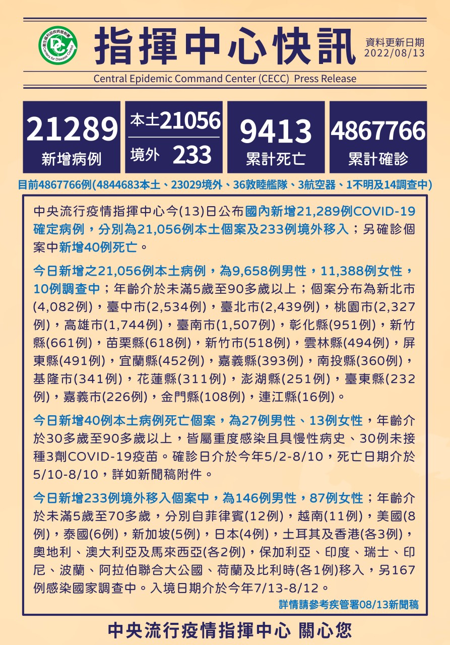 The Central Epidemic Command Center announced today (13) that there were 21,289 new confirmed cases of COVID-19 in Taiwan, including 21,056 local cases and 233 imported cases; 40 new deaths were confirmed among the confirmed cases.