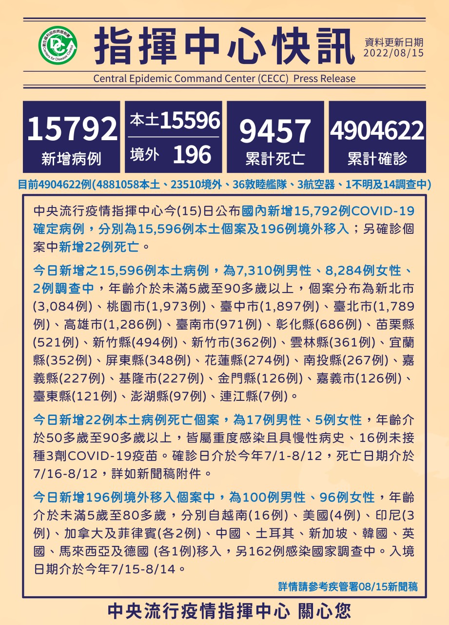 According to the statistics of the command center, up to now, a total of 15,374,706 cases of novel coronavirus pneumonia have been reported in Taiwan (including 10,499,540 excluded cases), of which 4,867,766 were confirmed, including 23,029 imported cases, 4,844,683 local cases, 36 Dunmu Fleet cases, 3 aircraft infections, 1 case is unknown and 14 cases are under investigation. Since 2020, a total of 9,413 COVID-19 deaths have been reported, of which 9,398 are local. The counties and cities of the cases are distributed in New Taipei City with 2,035 cases, Taipei City with 1,066 cases, Taichung City with 937 cases, Kaohsiung City with 867 cases, Tainan City with 732 cases and Taoyuan City. 712 cases in Changhua County, 395 in Pingtung County, 288 in Yunlin County, 275 in Nantou County, 218 in Miaoli County, 213 in Chiayi County, 211 in Keelung City, 190 in Yilan County, 154 in Chiayi City, There are 152 cases in Hualien County, 145 in Hsinchu County, 137 in Taitung County, 88 in Hsinchu City, 21 in Penghu County, and 15 in Kinmen County; the other 15 cases were imported from abroad.