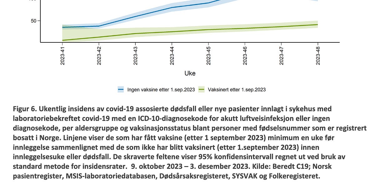 Figure 6 shows the development in the incidence of Covid-19-associated deaths or hospital admissions with laboratory-confirmed Covid-19 for people aged 65 and over [so, they no longer show you data for the entire ‘eligible’ population]. The figure shows the number of patients who received the vaccine after 1 September 2023 within a week before admission or death [drumroll]. The unvaccinated group are those who have not received any vaccine dose this autumn, i.e. no vaccination after 1 September 2023 and up to the week before admission or death . The total number of admissions or deaths in the two groups is currently low and there are also several important factors that must be taken into account in order to estimate vaccine effect, so the figures must be interpreted with caution.
