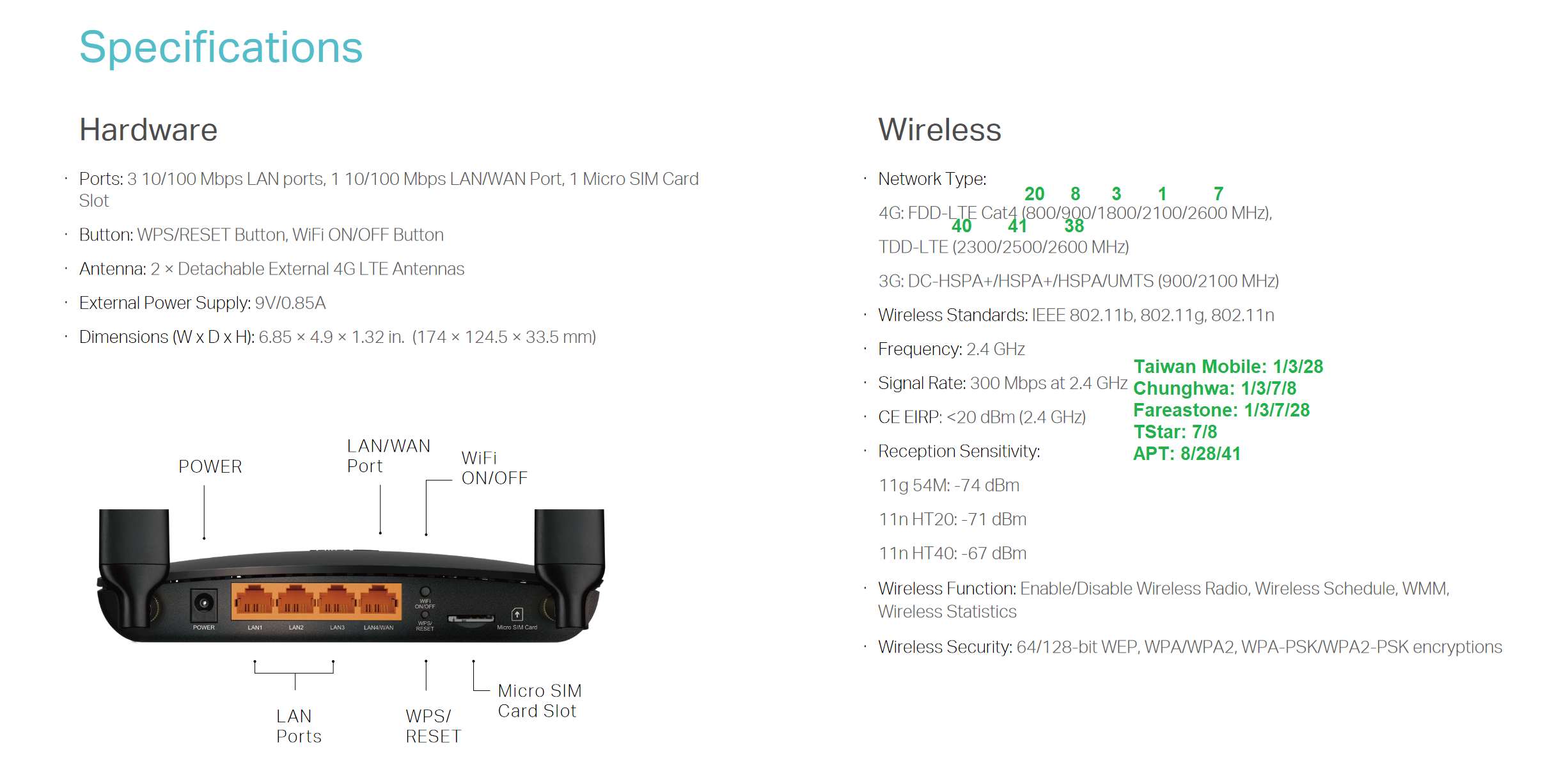 It appears to be missing Band 28, which Taiwan Mobile uses. Lower frequency bands tend to penetrate better into concrete and obstacles better than higher frequency bands. The only ones that are fully compatible are Tstar and Chunghwa. Since this router does not support the lower frequencies of the others, this MAY be an issue. But definitely only partially compatible.