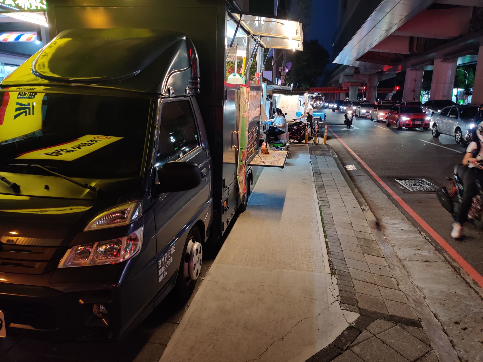 Perhaps four or five food trucks parked along the sidewalk/bicycle lane. Good job, Taichung!