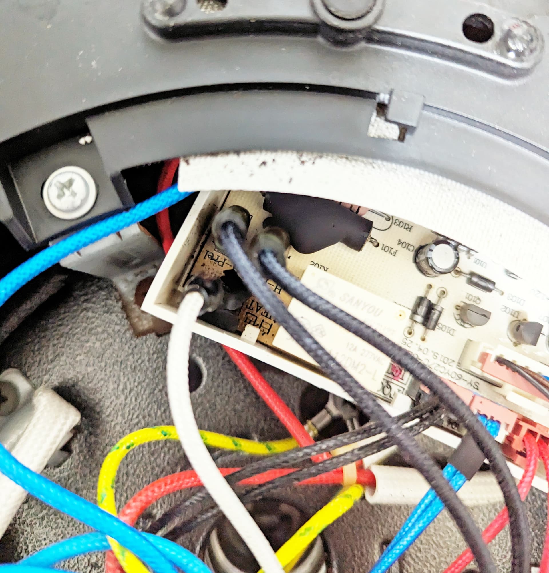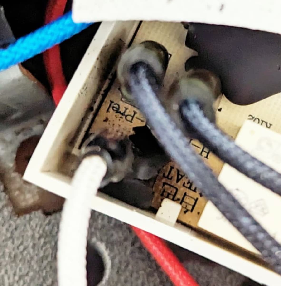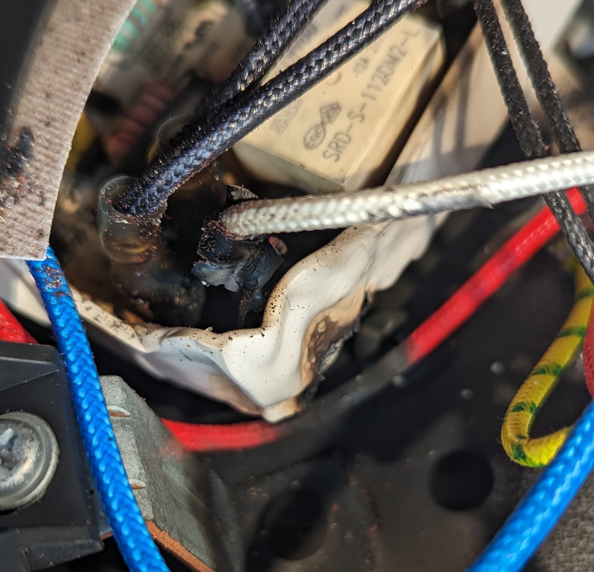 I’m not sure either. To my untrained eye, it looks to be either the connection between that white cable and the circuit board or whatever’s on the other side of the circuit board (the start of this thread has some more photos from last time, where the burning was much worse).