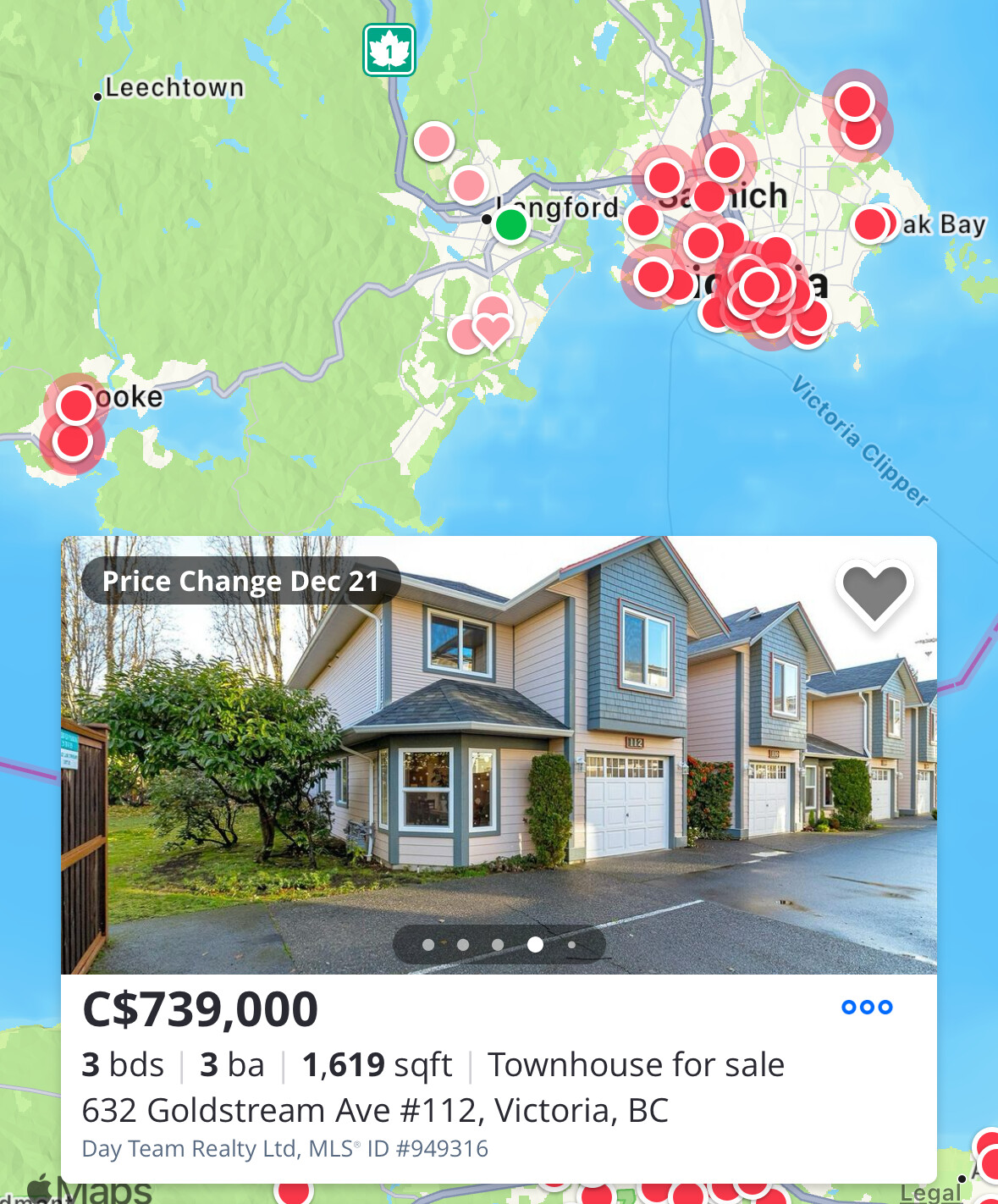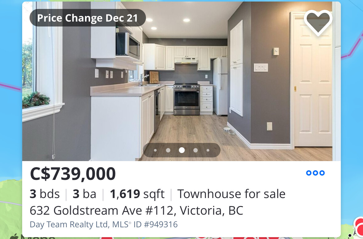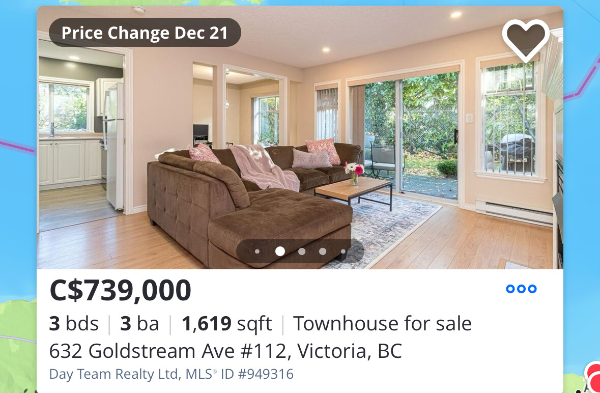 For example here is a decent corner unit townhouse with your own garage, 3 bedrooms, 2 bath, short drive from Victoria downtown and about 550k USD before negotiation. No driveway so you donāt have to shovel snow when old.