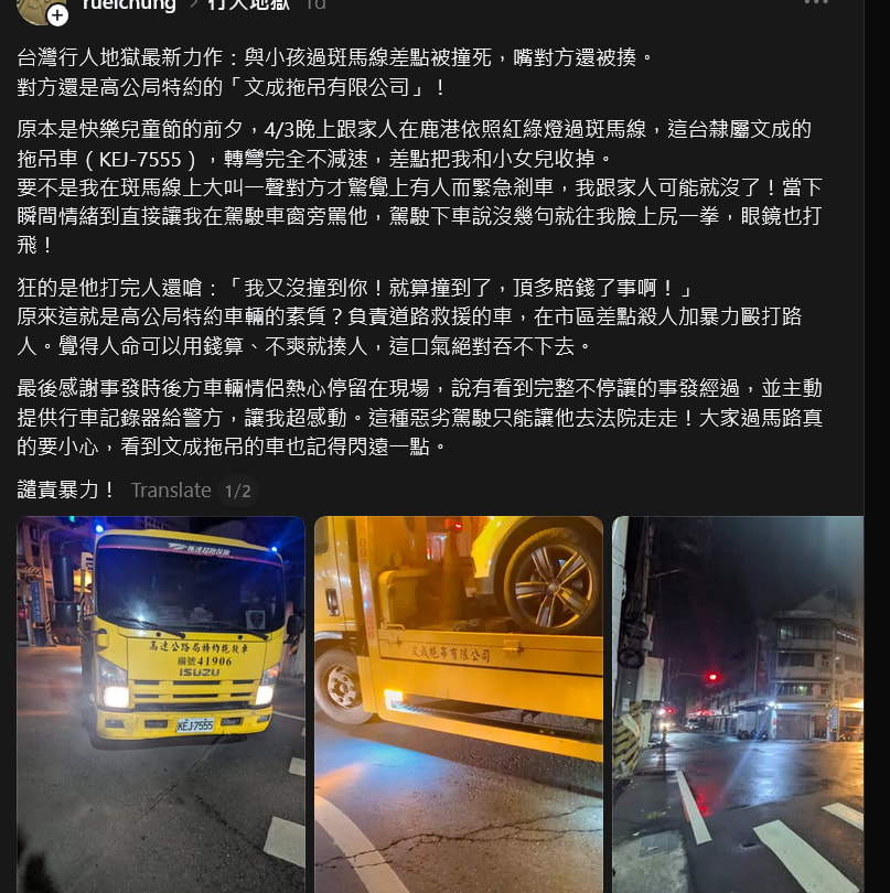 It was supposed to be the eve of a happy Children’s Day. On the night of April 3rd, while my family and I were crossing a crosswalk in Lukang according to the traffic lights, a tow truck belonging to Wencheng Towing Co., Ltd. (License Plate: KEJ-7555) — a contractor for the National Freeway Bureau — turned without slowing down at all. It almost took out both me and my young daughter.