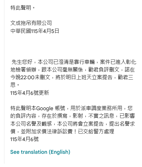 [Message to User] Hello Sir, our company has already clarified that this is a contracted owner-operator vehicle. The case has entered investigation by the Changhua District Prosecutors Office and has absolutely nothing to do with our company. We advise you to delete your negative review and post. If the post is not deleted by 10:00 PM tonight, we will file a formal lawsuit on the next business day. We advise you to think twice. Updated: April 6, 2026