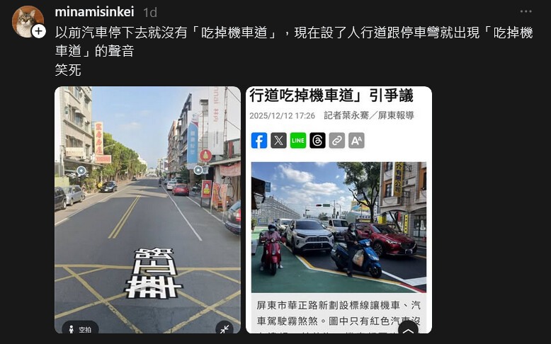 More people complaining about sidewalks. This time in Pingtung as painted sidewalks are put in and traffic lane removes the motorcycle/slow lane leaving a single traffic lane each way. The complaint is that the motorcycle/slow lane isn’t there anymore. Guess what, it was never really usable due to all the illegal parking there anyways so it’s no difference. If anything the change is better as it provides more legal parking, whereas before most parking was illegal…not that the police would care.