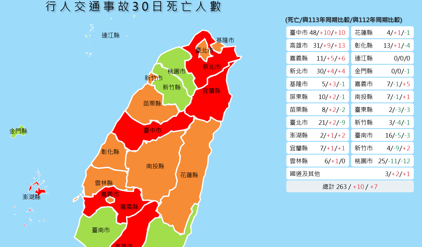 Speaking of Taichung, so far Taichung still maintains it’s top spot for the deadliest city/county in the country for pedestrians in terms of raw numbers. Top spot for both the current number of pedestrians deaths for 2025 (as of latest public release of data so far) and INCREASE in number of pedestrians deaths when compared to both 2024 and 2023 (for the same period of time).