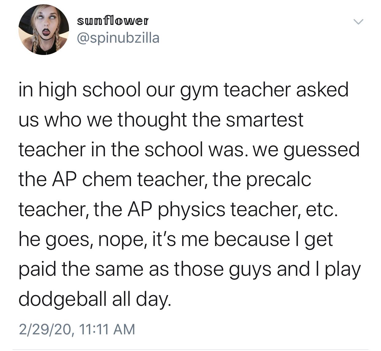 Dodgeball seems like one of those activities that would seem fun for half an hour, but drive me nuts if I had to do it for hours every day.