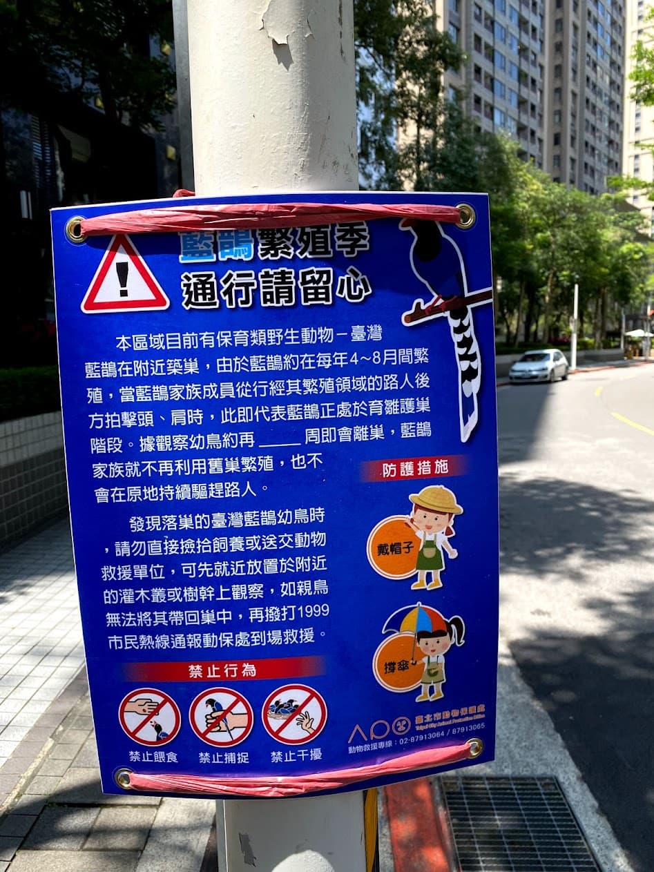 There are currently protected wild animals in this area - Taiwan blue magpies are nesting nearby. Since blue magpies breed from April to August every year, when blue magpie family members slap their heads and shoulders from the back of passers-by who pass by their breeding areas, the That means that the blue magpie is in the family of brooding and protecting the nest, so it will no longer use the old nest to reproduce, and it will not continue to drive passers-by in place. According to observation, the young bird will leave the nest in about another week.