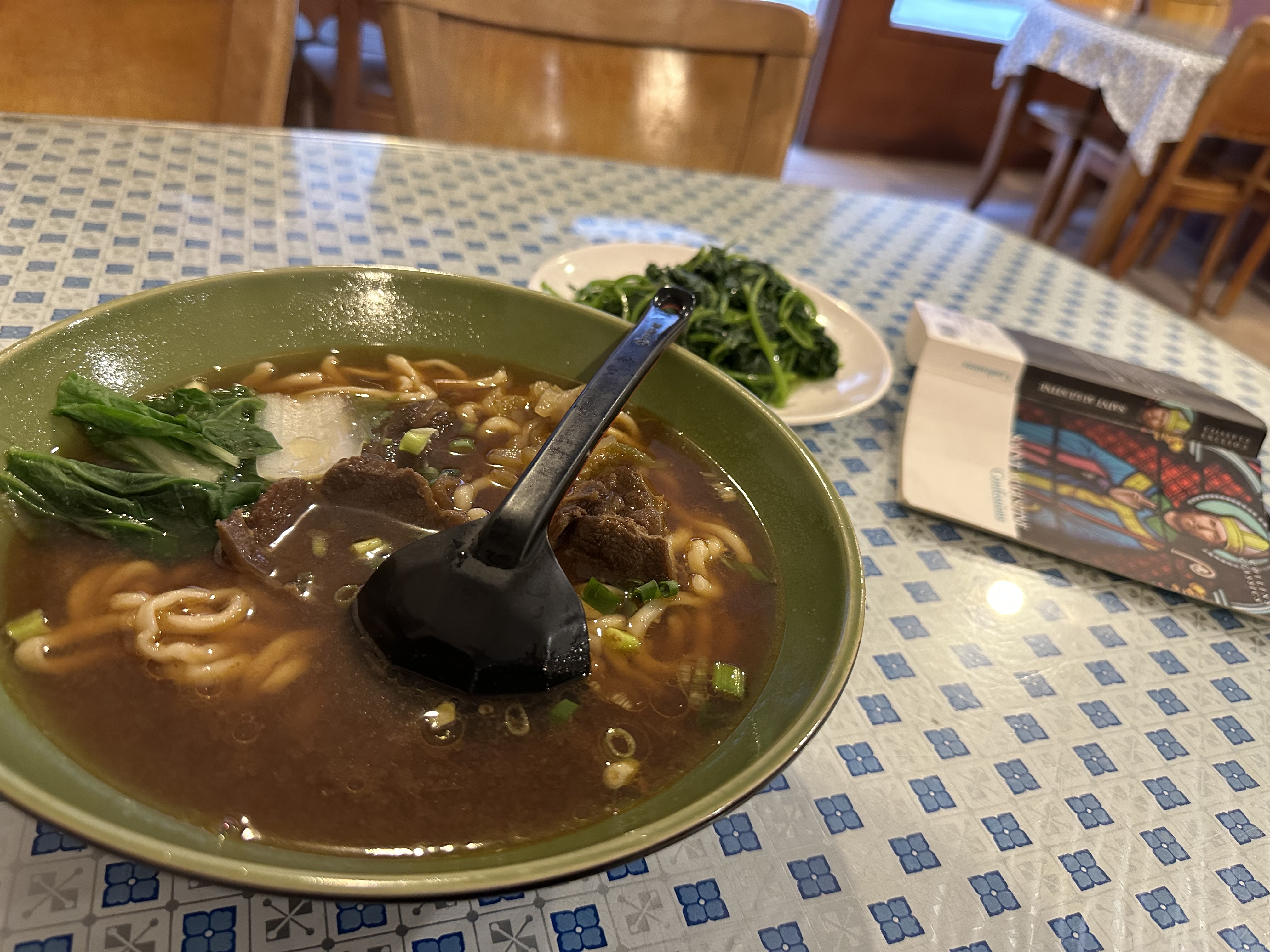 Food was weighing on my mind last night. Restaurants close around 6pm or earlier, and the friend chicken place was closed yesterday too. So today I went to the beef noodle lady’s place and it too was closed today Ugh, however she said she’s been getting so many take out orders she could do one more. Kewl. We started talking a bit and she said don’t worry, just sit down and eat here, so I did. My sweet baby Jesus it was good, and not Beigan after two days of 7-11 bowel cement. Like Taipei beef noodle festival good.