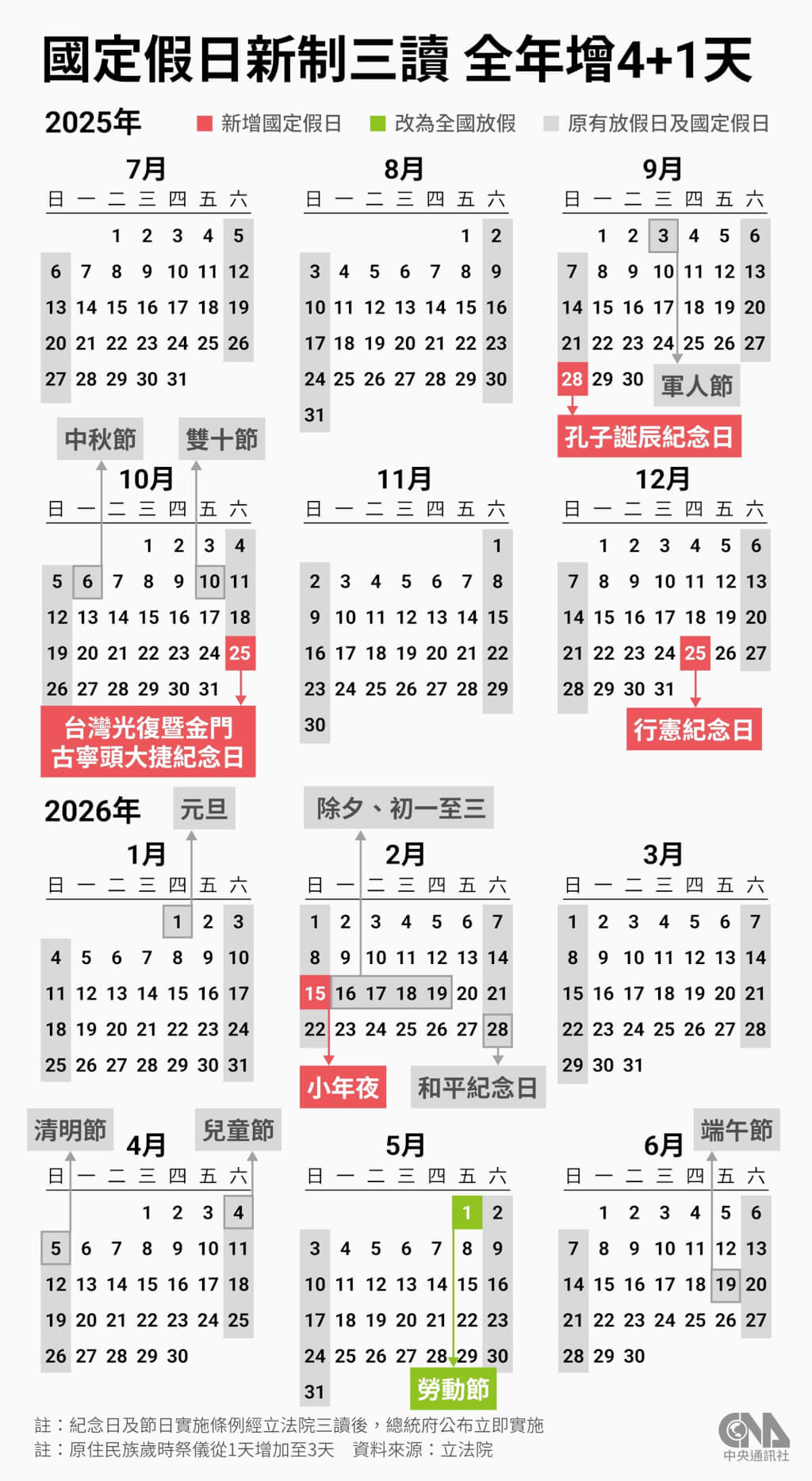 According to the amendment, the legislation would be implemented on the day it is promulgated by the president, meaning that there would be three additional holidays in the second half of this year on Sept. 28, Oct. 25 and Dec. 25.
