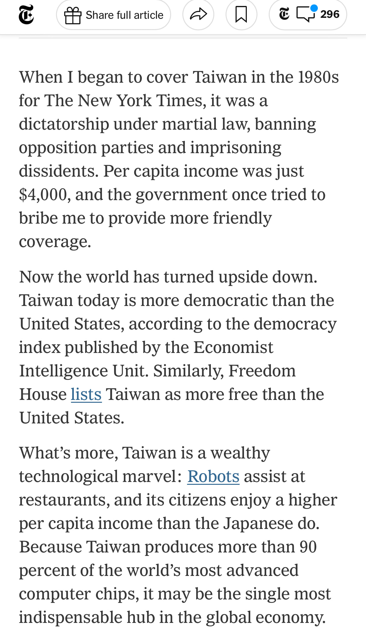 Having now read the full article—it does not seem to be paywalled—I suppose the difference is that Kristof expresses his astonishment at how things have changed in parts of Asia including in Taiwan.