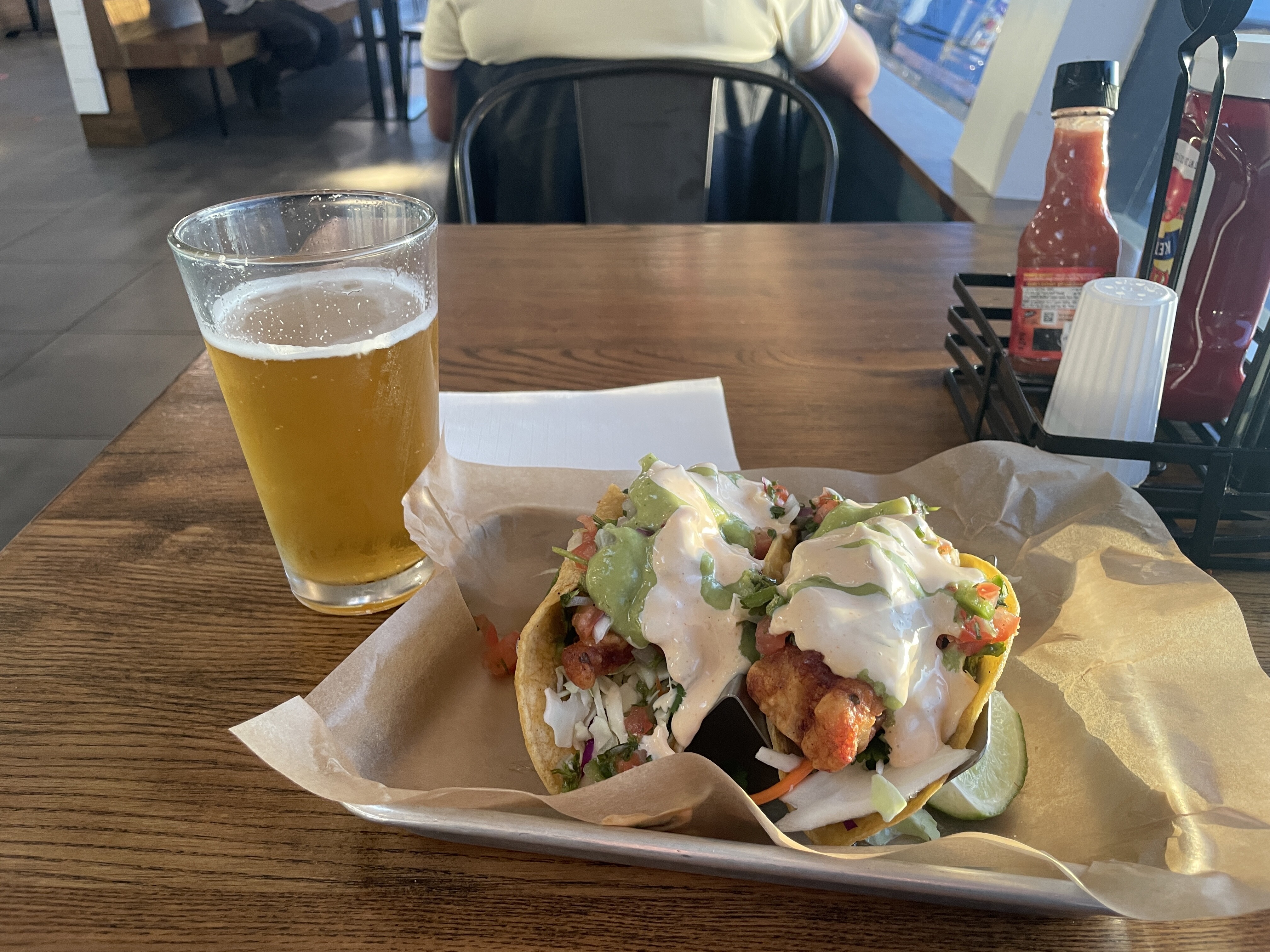 2 fish tacos for 16 and a draft for 6 added up to 27 with tax and service