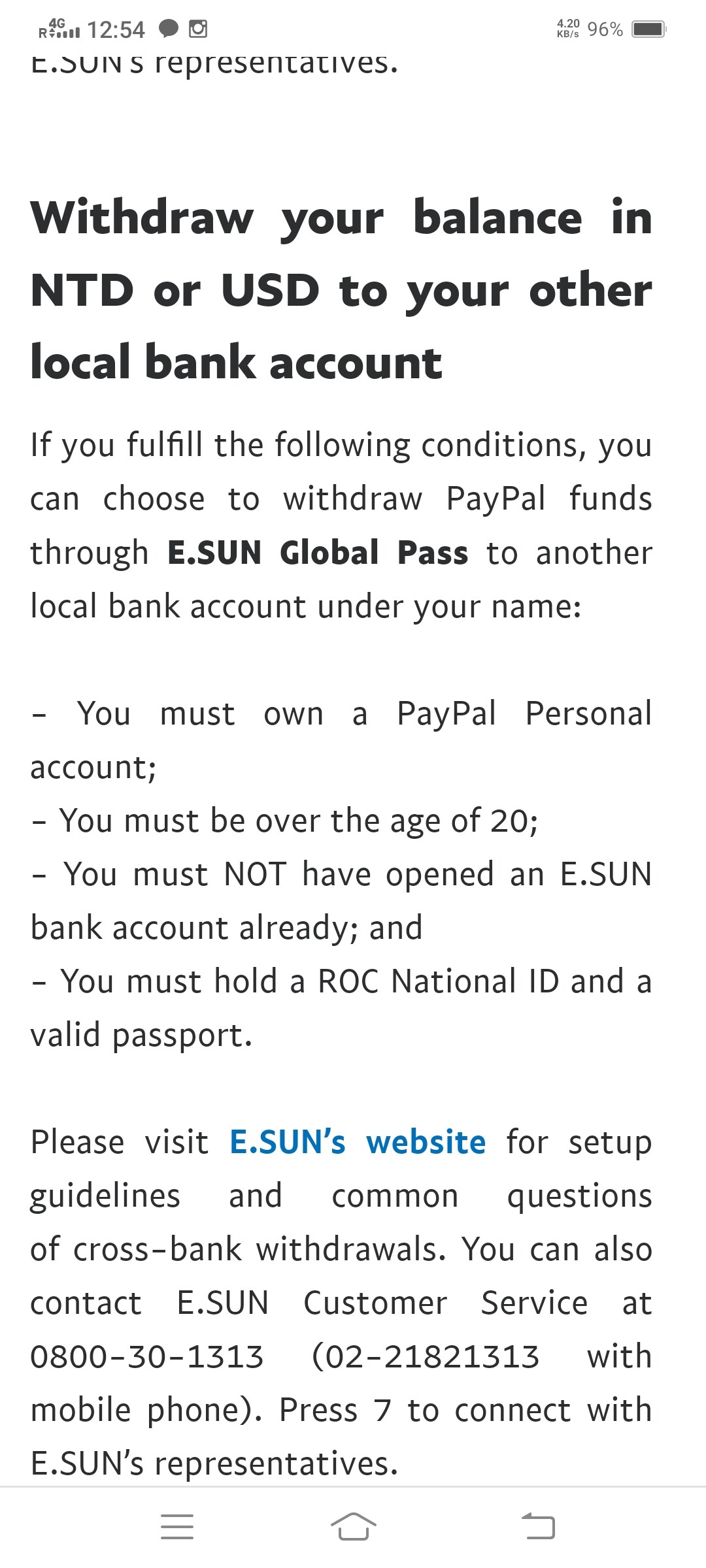 You need an E.Sun bank account to use PayPal. You need to go into E.Sun and set it up to receive money from PayPal. This is separate from setting up a bank account, so you need to tell them you want to use PayPal. This works fine for money coming from out of Taiwan. Iāve used it a number of times although the exchange rate is crap.