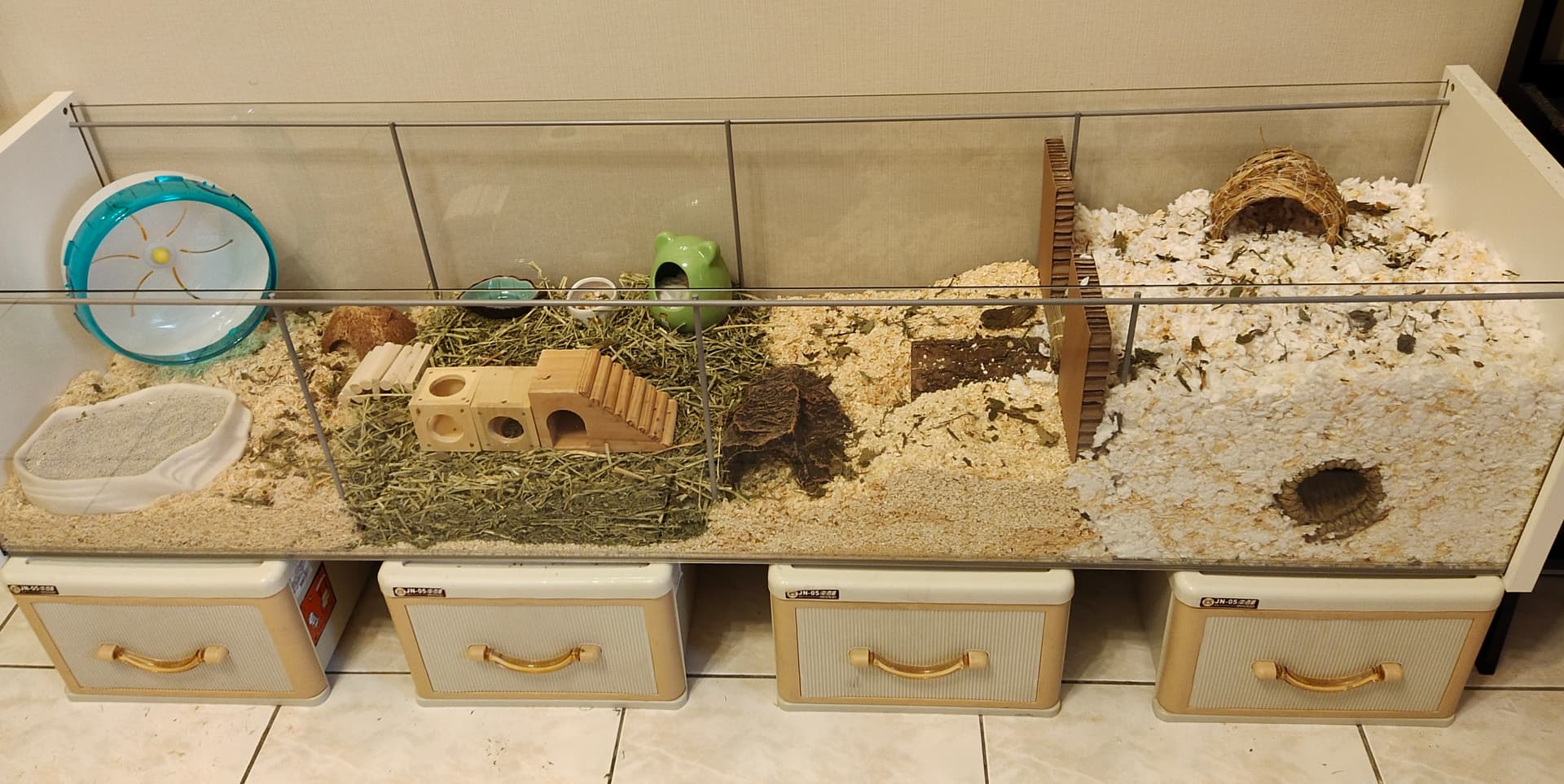 I got the idea from YouTube videos. Look up Ikea Detolf. It’s a glass shelving unit that many hamster owners have converted to swanky enclosures. The Ikea in Taoyuan carries it so I would assume other locations do as well. Took me less than an hour to build by myself. I used these cheap disposable barbecue grills as a lid…