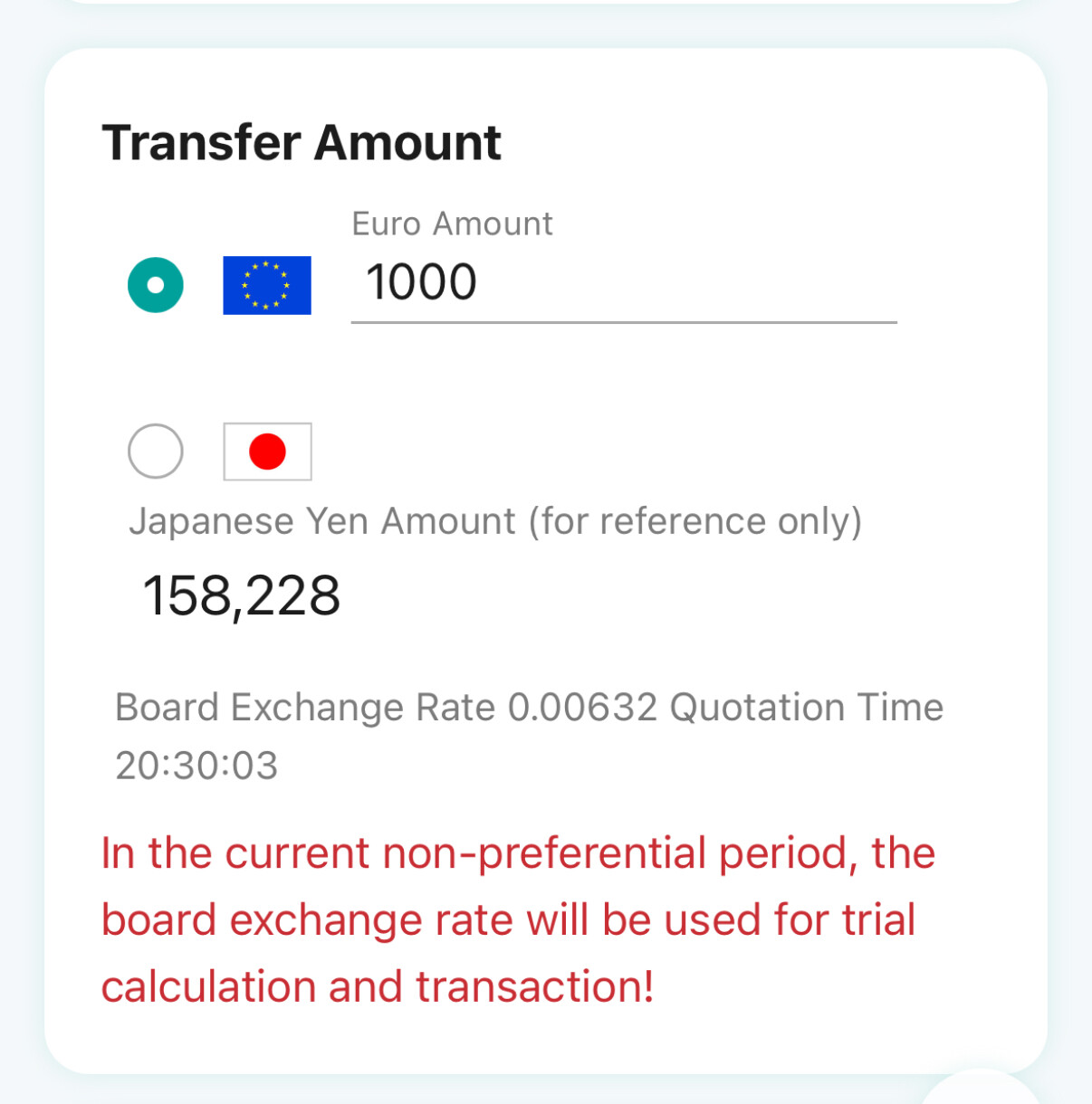 Meanwhile, the quotes are 35.51 for EUR → TWD and 0.2243 for TWD → JPY, so one EUR should give 158.315 JPY when doing two exchanges.