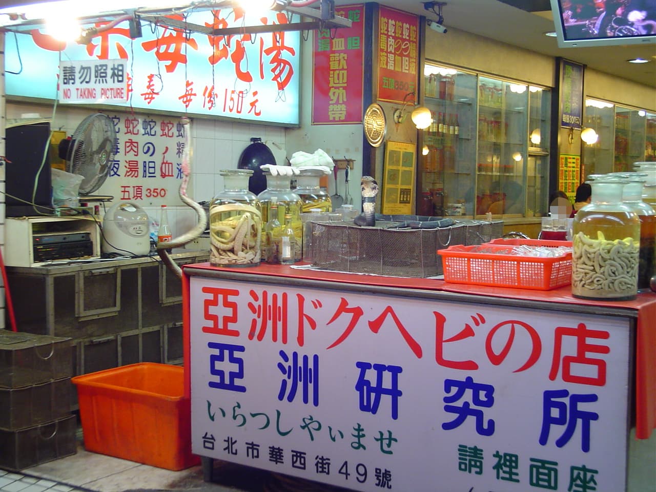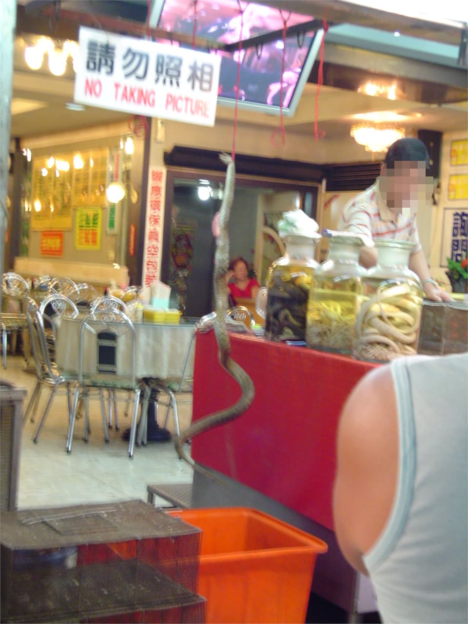This picture is somewhat blurry, but in the middle there is a snake hanging by a hook and being drained of blood. The shop owner is casting me the evil eye…