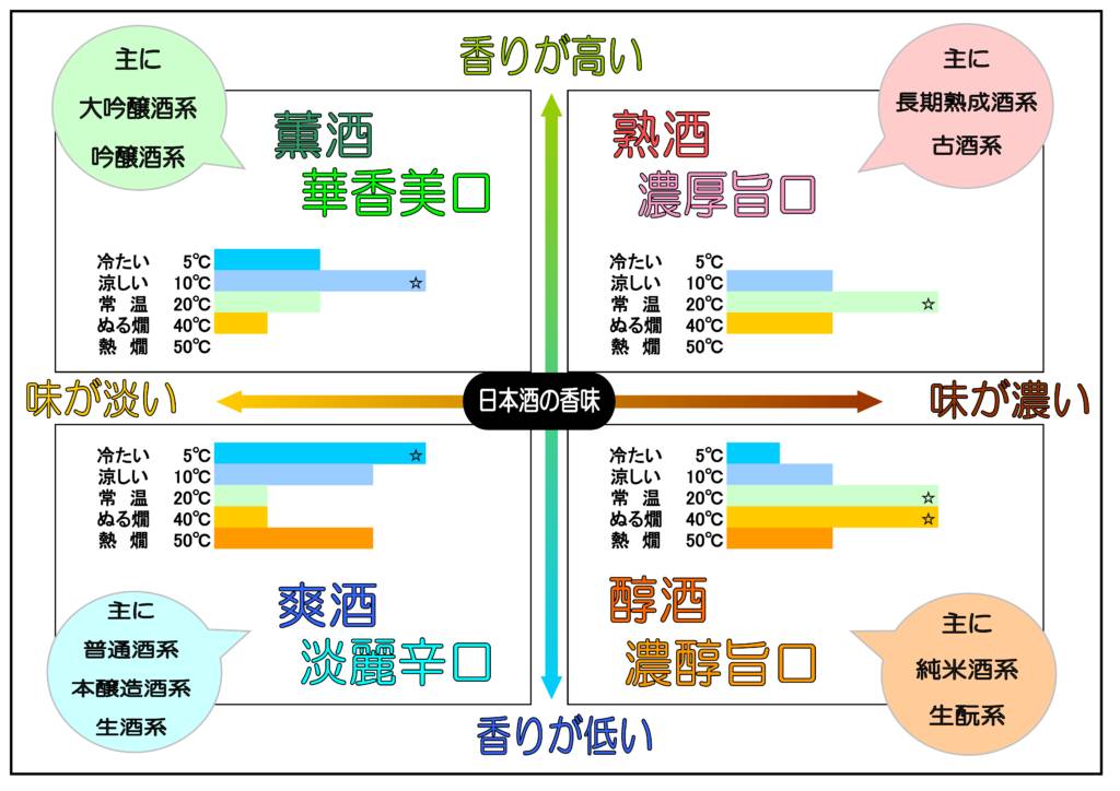 A green arrow pointing up indicates a more fragrant sake, while a blue arrow pointing down means less aroma.