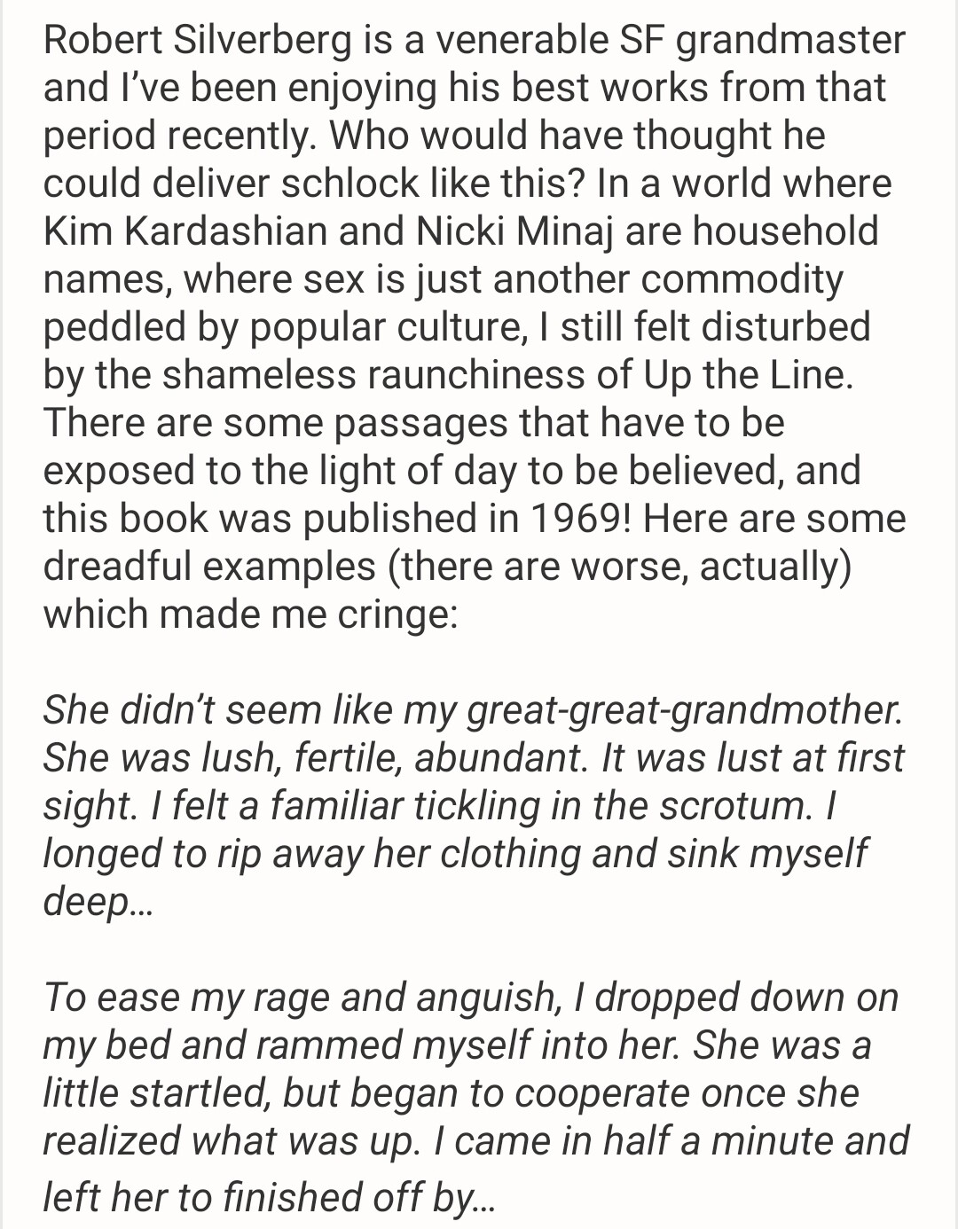 I didn’t see why everybody in science fiction had to be a honky named Bob or Joe or Bill. I didn’t see why everybody in heroic fantasy had to be white (and why all the leading women had “violet eyes”).