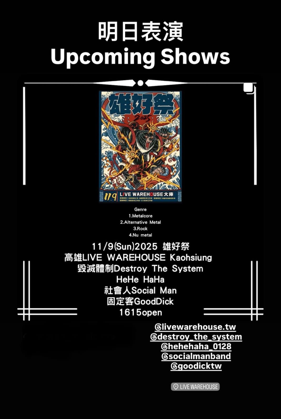 Sun, Nov 9 at Live Warehouse, KH: Metalcore, alt Metal, rock, Nü Metal