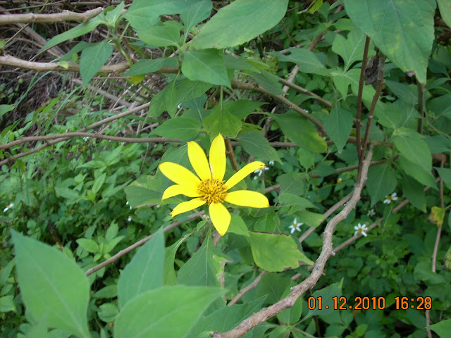 And I also saw some very tall yellow flowers. They were more than one meter tall. I couldn’t get a close-up of them because the weeds were too thick. Here’s a picture of the flowers: