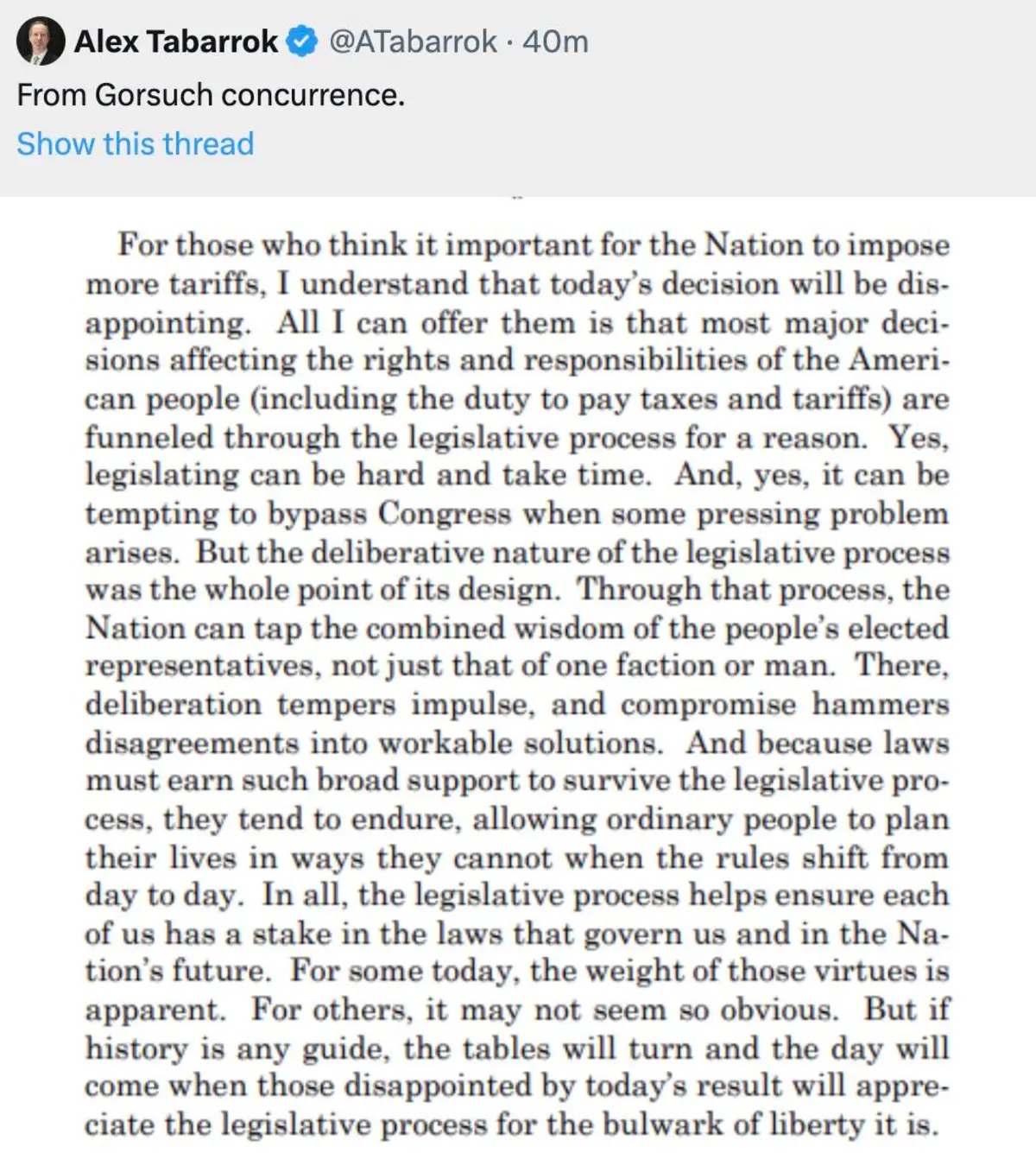 The Courtâs decision was not just about tariffs. Supreme Court Justice Gorsuch is clearly directing this missive at the entire Trump Presidency.