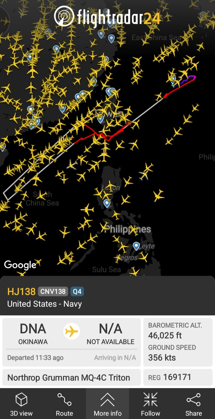 Just noticed this interesting MQ-4C Triton drone flight out of Okinawa through the Bashi channel flying at 46000 ft.