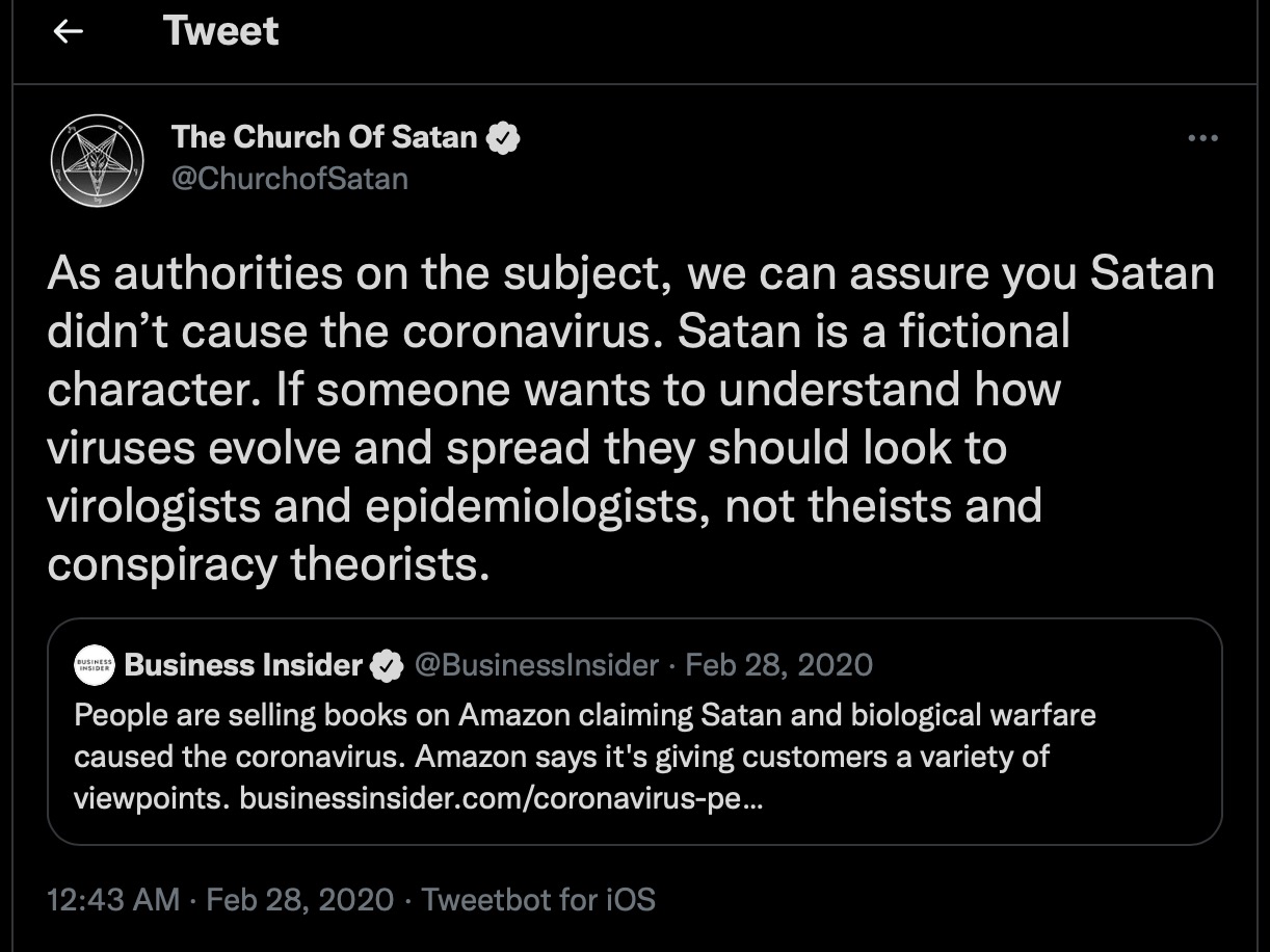 Yeh…like the story I saw that in America some people are claiming that followers of Satan always stand 6 feet apart. So therefore, with all of this social distancing you can spot the Satanists who want to keep at least 6 feet apart.